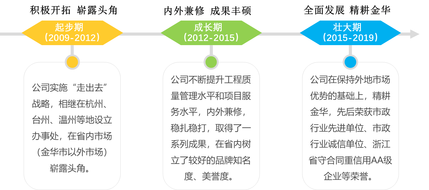 公司面對行業(yè)變化,調(diào)整經(jīng)營策略,在保持外地市場優(yōu)勢的基礎(chǔ)上,精耕金華市場,注重全面發(fā)展。公司先后榮獲浙江省先進(jìn)建筑業(yè)企業(yè)、金華市建筑業(yè)骨干企業(yè)、 金華市先進(jìn)建筑業(yè)企業(yè)、金華市建筑業(yè)誠信企業(yè)、市政行業(yè)先進(jìn)單位、市政行業(yè)誠信單位、浙江省守合同重信用AA級企業(yè)等榮譽(yù)。主要大事跡有: