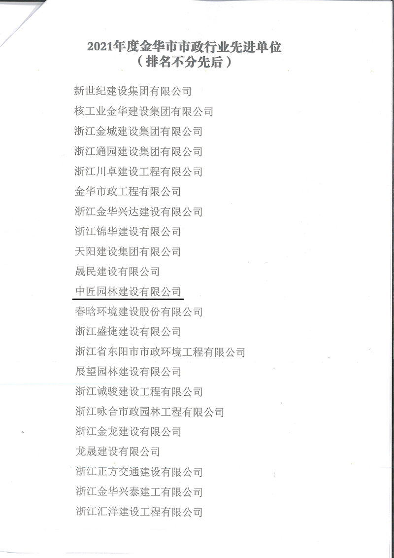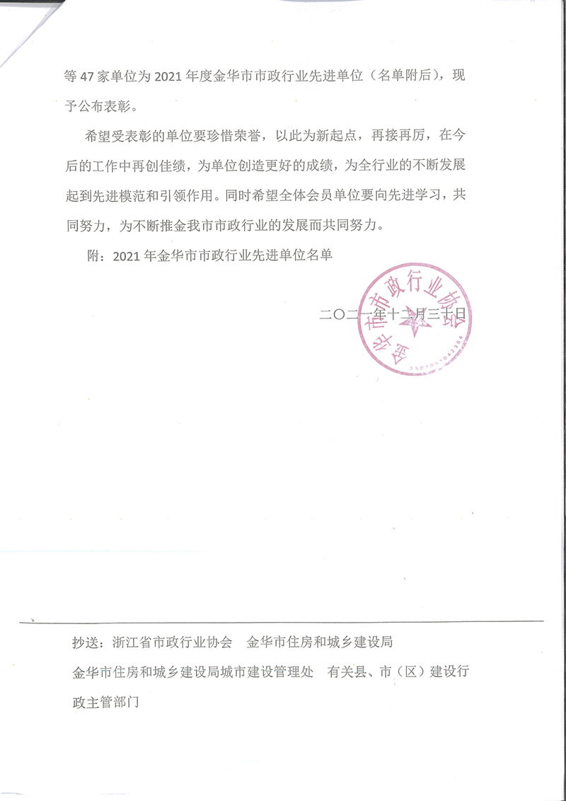 關(guān)于公布表彰2021年度金華市市政行業(yè)先進單位的通知