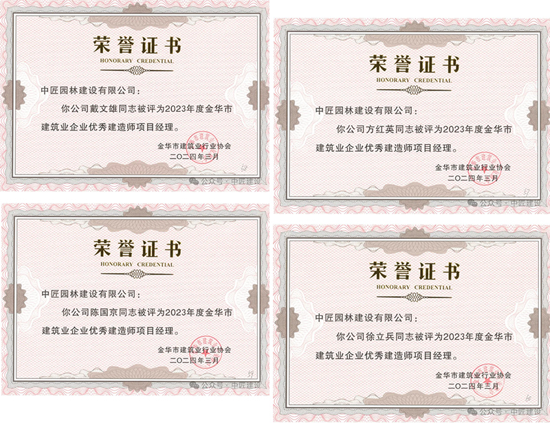 與此同時(shí),公司的杰出人才也獲得了應(yīng)有的認(rèn)可。戴文雄、方紅英、陳國(guó)京、徐立兵四位優(yōu)秀項(xiàng)目經(jīng)理,憑借其卓越的領(lǐng)導(dǎo)力和項(xiàng)目管理能力,榮獲2023年度金華市建筑業(yè)企業(yè)優(yōu)秀建造師項(xiàng)目經(jīng)理稱號(hào)。